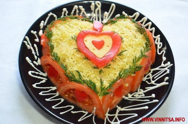 Куриное филе отварить и порезать кубиками,  шампиньоны обжарить с минимальным добавлением жира, выкласть на блюдо слоями в форме сердца :