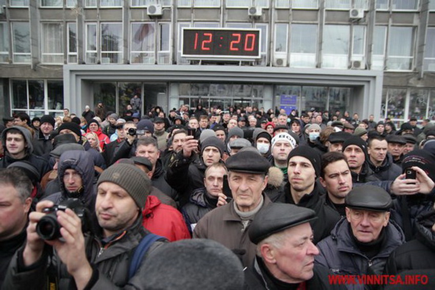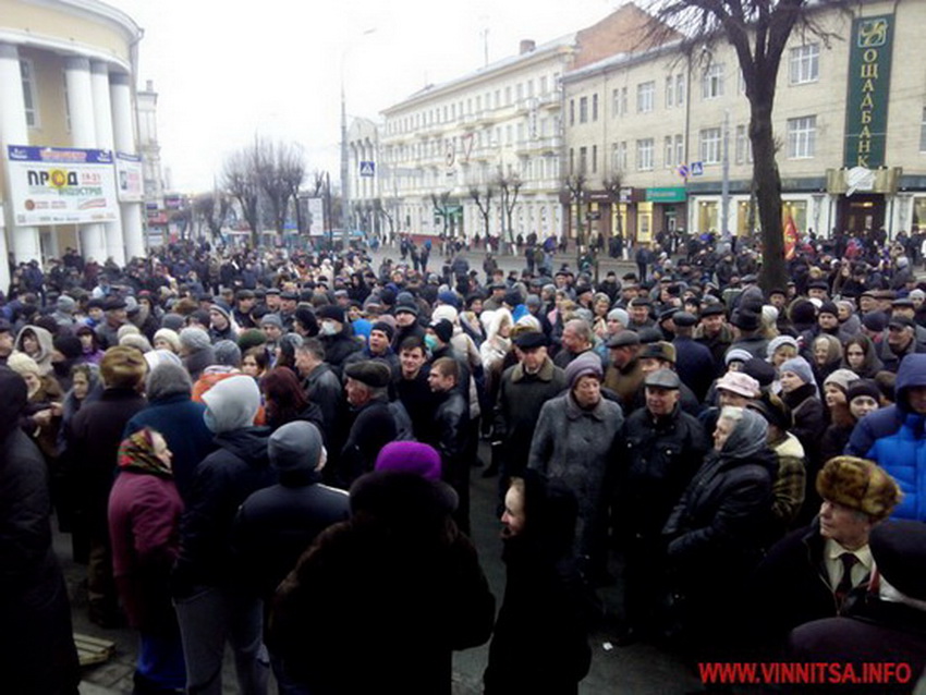 Вінниця. Вінничани перекрили рух в центрі Вінниці через війну в Києві. Близько 100 людей скандували: «Вінниця – вставай!», «Слава героям Майдану». Через кілька годин тисячі вінничан приєднались до мітингувальників.