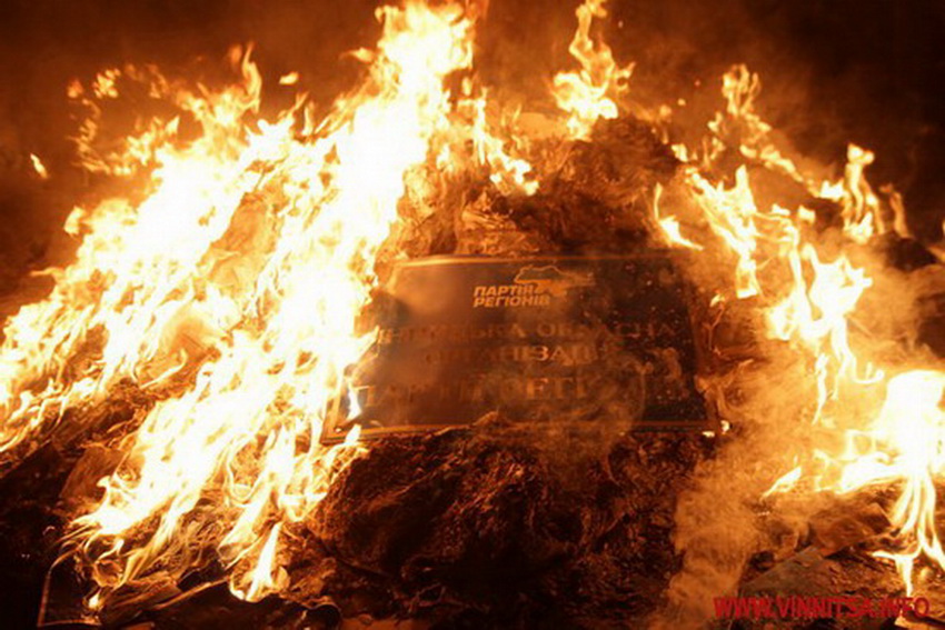 Протестувальники спалюють символіку «Партії рерігонів».