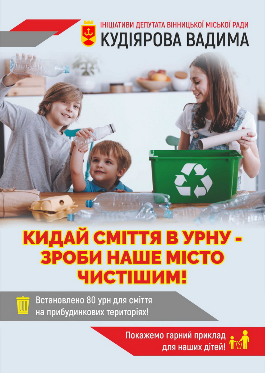 Ініціатором проекту «Кидай сміття в урну – зроби наше місто чистішим!» виступив депутат Вінницької міської ради Вадим Кудіяров. Днями на території свого округу він спільно із волонтерами встановив 80 урн для сміття. Це було зроблено за власні кошти депутата. Отже, в окрузі, до якого входять частини мікрорайонів «Олієжиркомбінату» та «Військового містечка» буде значно чистіше.