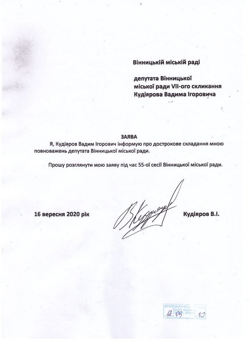 Вадим Кудіяров написав заяву про дострокове складання повноважень депутата Вінницької міської ради.