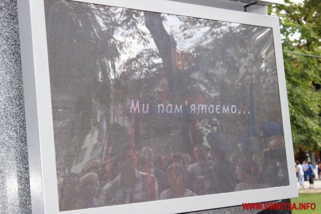 На мультимедійному екрані під відповідний музичний супровід транслювали фотографії 121 вінничанина (троє Героїв Небесної Сотні) інформацію при яких обставинах вони загинули та які мають державні нагороди.