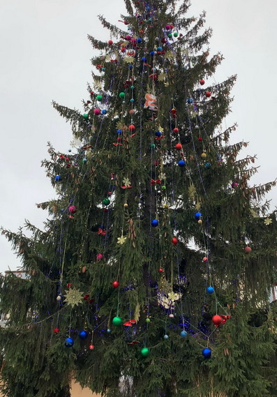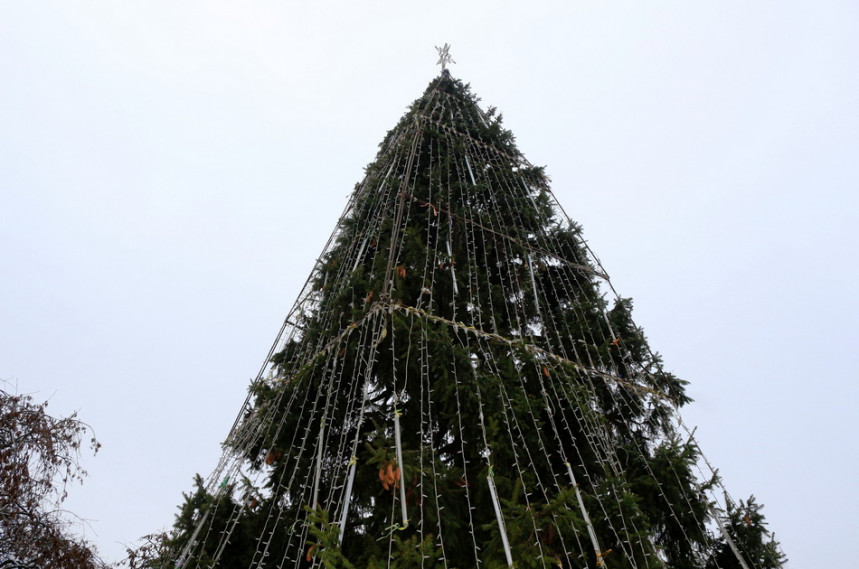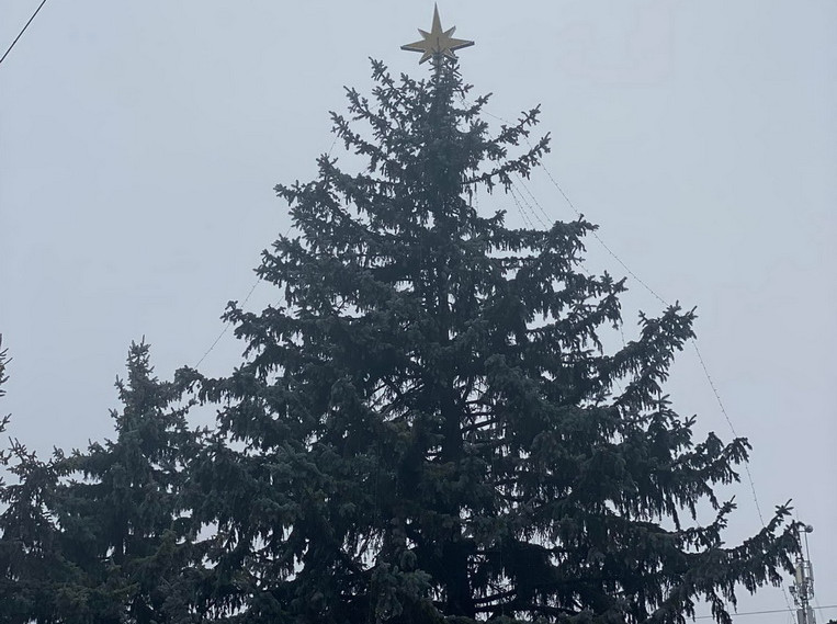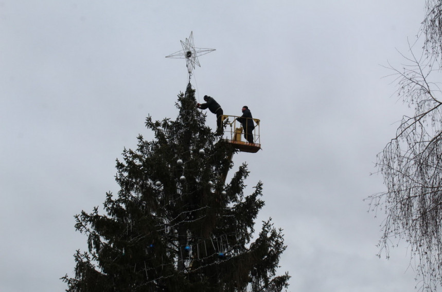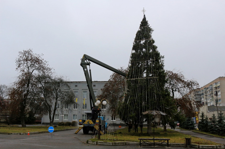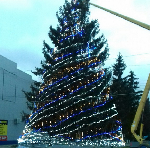 На Європейській площі Іллінців комунальники прикрасили живу головну новорічну ялинку, яка підростаючи щороку сягнула нині 20-метрової висоти, а діаметр нижнього кола складає 10 метрів.