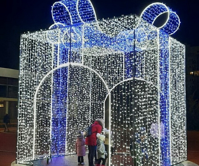 У Ладижині змонтували резиденцію Святого Миколая у формі велетенського подарункового пакунка. Конструкцію оснастили ілюмінацією.