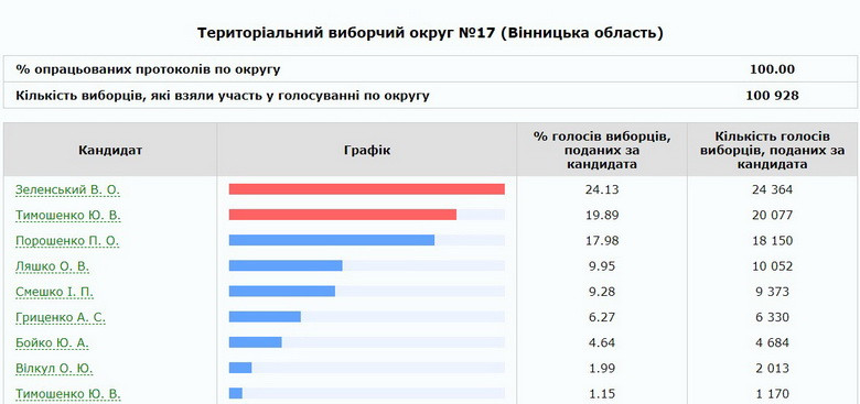 ЦВК опрацювала 100% протоколів з результатами голосування 100928 виборців на 17-у окрузі (місто Ладижин, Бершадський, Гайсинський, Теплицький, Тростянецький райони). З різницею понад 4 тисячі голосів виборців на окрузі переміг Володимир Зеленський (24.13%). На другому місці Юлія Тимошенко (19.89%), на третьому - Петро Порошенко (17.98%).