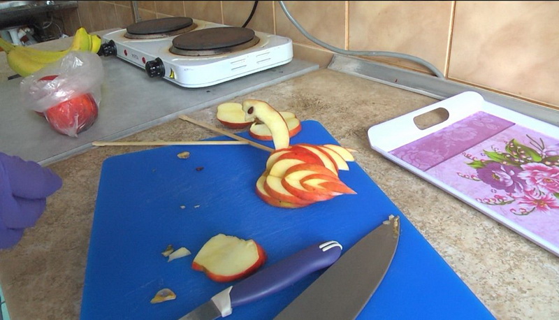 Приголомшений новиною Іван вирішив привітати підопічних. Оскільки він кухар, то вирізає для них з яблук два лебеді.