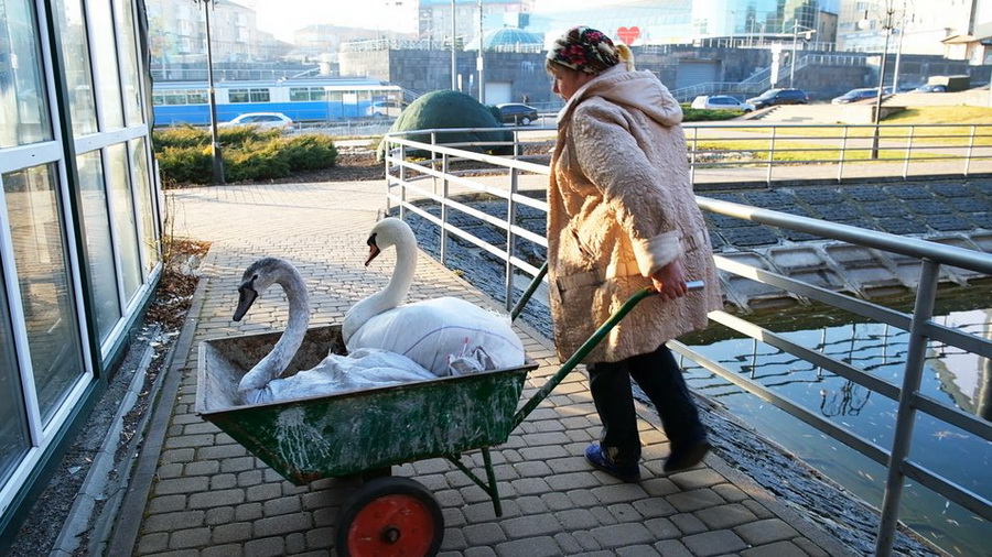 Лебедів, що мешкають в озері Центрального парку Вінниці, перевезли на зиму до зоодворика. Шестеро пернатих мешкатимуть у теплому вольєрі до весни.