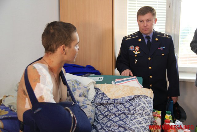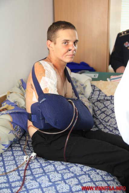 В післяопераційній палаті лежить 24-річний Руслан Карпець, родом з Тернопільщини. Хлопець отримав важкі поранення вніч з 14 на 15 вересня в Дебальцеве. Руслан втратив руку. Олексія Порошенка Руслан попросив допомогти йому з протезуванням. Протез який йому треба роблять в Німеччині або в Англії.