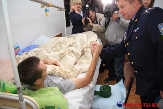 Хлопці на лікарняних ліжках здебільшого із вогнепальними пораненнями. Один з них 20-річний десантник з Яворова, якому лікуватись потрібно щонайменше 4 місяці. Поранення хлопець отримав внаслідок обстрілу з «Граду». Але попри складні травми, він тримається, каже «Нас морально підтримують, діти листи приносять».