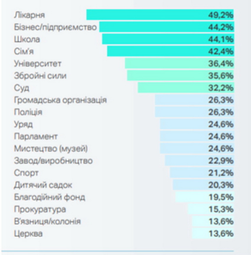 Бачимо, що армія із беззаперечного лідера перемістилась на 6-те місце, церква взагалі зайняла останню позицію, а громадські організації, що завжди мали ≈50%, отримали вдвічі менше – 26%.