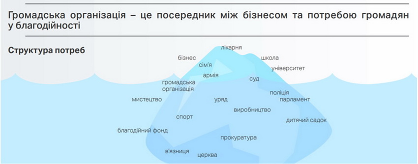 «На перший погляд громадська організація займає тільки 8-ме місце у рейтингу соціальних потреб громадян. Але одночасно вона стала головною прихованою потребою для тих респондентів, які пріоритетним для себе визначили бізнес. З іншого боку спорідненим для громадської організації став благодійний фонд, їхня аудиторія збігається у 72%. Це означає, що на підсвідомому рівні громадська організація сприймається як посередник між бізнесом та потребою людей у благодійності», ‒ уточнює Марина Мармеладзе.