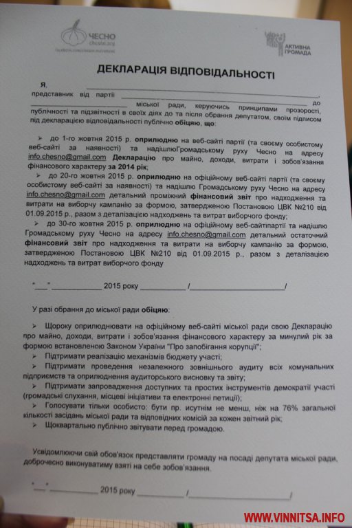 «У Вінниці жодна з 18 партій не підписали декларації відповідальності. Аргументуючи це тим, що немає довіри до кампанії, немає бажання щоб їх порівнювали чи маніпулювали», - зазначила координатор руху «ЧЕСНО» у Вінниці Софія Мельник.