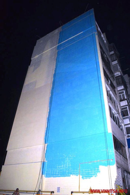 Коли добре стемніло, картинку з велетенським літаком перенесли на стіну 9-поверхівки за допомогою проектора. Художники одразу відтворювали зображення за допомогою фарб. На висоту піднімалися за допомогою підвісної люльки. Малювати почали з блакитного фону.