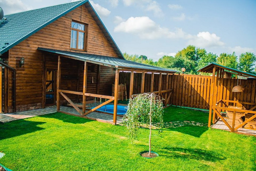На території дерев’яні будиночки, альтанки, сауна, басейн. Поруч – озеро, де можна порибалити.