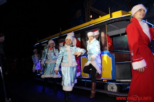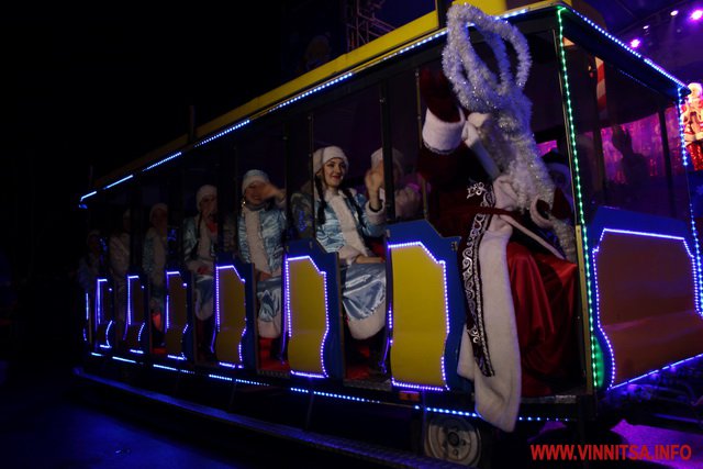 Розпочалося свято з приїзду новорічного потягу, який привіз на дійство Дідів Морозів і Снігурок.