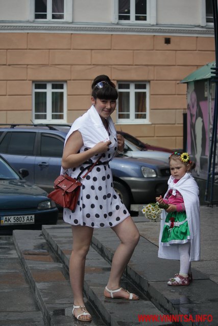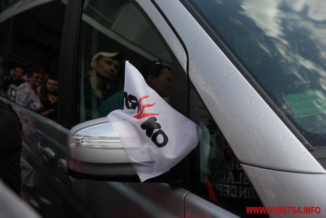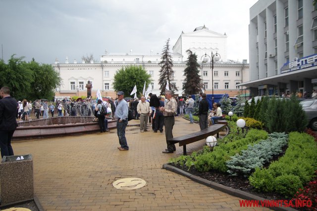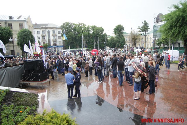 Отже, кілька сотень вінничан, незважаючи на шалену зливу із блискавкою, все ж таки зібрались на площі Небесної сотні в очікуванні одкровень радикального лідера Олега Ляшка. Він запізнюється, тож його помічники вирішили в очікуванні свого шефа трохи порадувати вінничан халявою. Як тільки натовп дізнається, що з сріблястого мікроавтобусу видають футболки з "вилами Ляшка", значна кількість людей швидко переміщується до нього. Правда вистачило халявного одягу далеко не всім, за кілька хвилин все розібрали, як гарячі пиріжки на базарі.