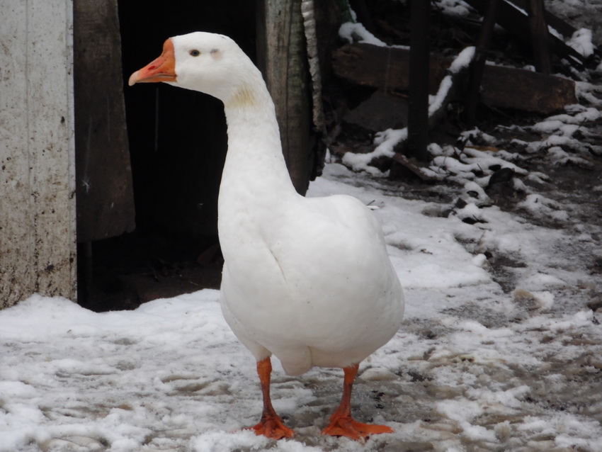 «2 роки тому, гуска Блонда мала гусенят. І все було б добре, але в двір забігла лисиця і напала. Блонда, захищаючи своїх дітей, вчепилася дзьобом у лисицю і зі всієї сили била її крилами. Свідком цієї ситуації стала моя бабуся. Вона відігнала лисицю і та відступила. Блонда була вся покусана, з травмованою ногою. Але найстрашніше - лисиця відкусила їх нижню частину дзьоба, майже всю. Біля двох місяців Блонду годували вручну, а пізніше вона призвичаїлась, і уже стала їсти самостійно. В той час, коли гуска не могла самостійно дбати про пташенят, тимчасово обов'язки матері взяла на себе її сестра Герда».