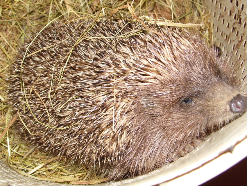«Її знайшла вінничанка на березі Вишенського озера. Там косили траву косарками і ними ж перебили гніздо з маленькими, ще сліпими їжаченятами. Жінка знайшла лише одного живого. Передали мені. Це мій перший досвід роботи з їжаками, щей з новонародженим, але все вийшло, безсонні ночі і годування кожні 2 години дали свої результати - Їжуля вижила і стала великою і розкішною дамою. Зараз вона готується до зимової сплячки, а вже весною її чекає адаптація і випуск у дику природу. Окрім неї в мене ще три їжака, які теж будуть випущені навесні».