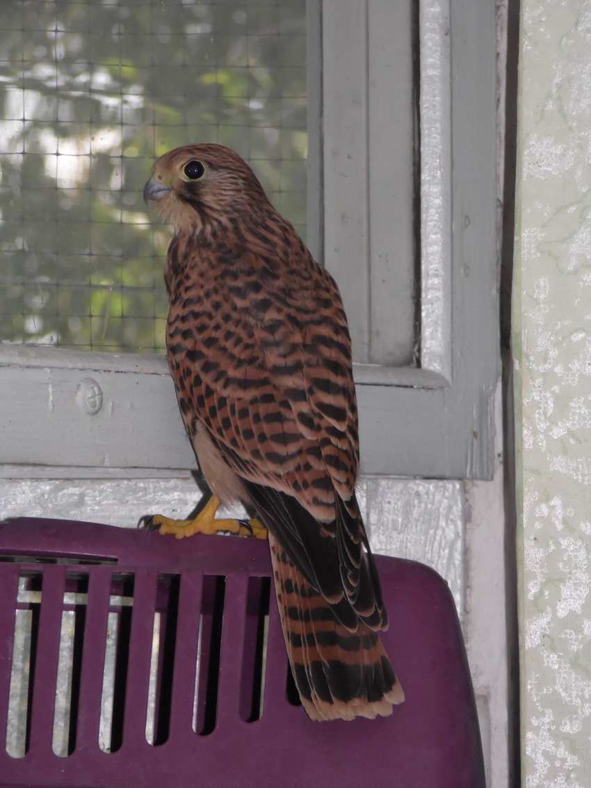 «Птах родини соколових. В цьому році їх у мене було 8, з них 7 птахів поїхало на адаптацію до Житомирської області і були випущені, один, на жаль, не вижив, було сильне ураження опаришами».