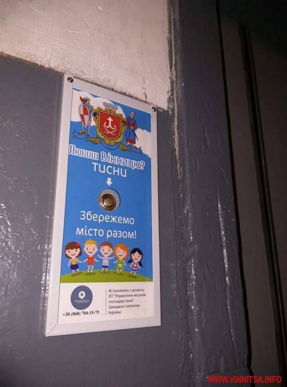В одній з багатоповерхівок Вінниці, яка розташовується по вулиці Литвиненко, кілька днів тому біля кнопки ліфта в одному з під’їздів приєднали яскраву об’яву-заклик: «Любиш Вінницю? Тисни. Збережемо місто разом!». Мешканці дивуються та не розуміють, який зміст несе табличка з символами міста.