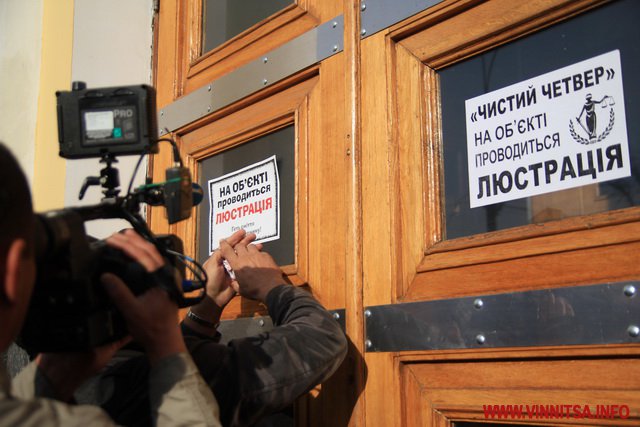 Активісти з народною самообороною, ранок 2 жовтня у Вінниці почали з анонсованого на передодні «чистого люстраційного четверга». Слід зауважити, що вінничани після анонсу «люстраційного четверга» та подій з побиттям Шуфрича в Одесі, чекали що люстрація по-вінницькі також підтримає естафету сміттєвих баків. Але все було культурно, обійшлось без бійок і смітників.