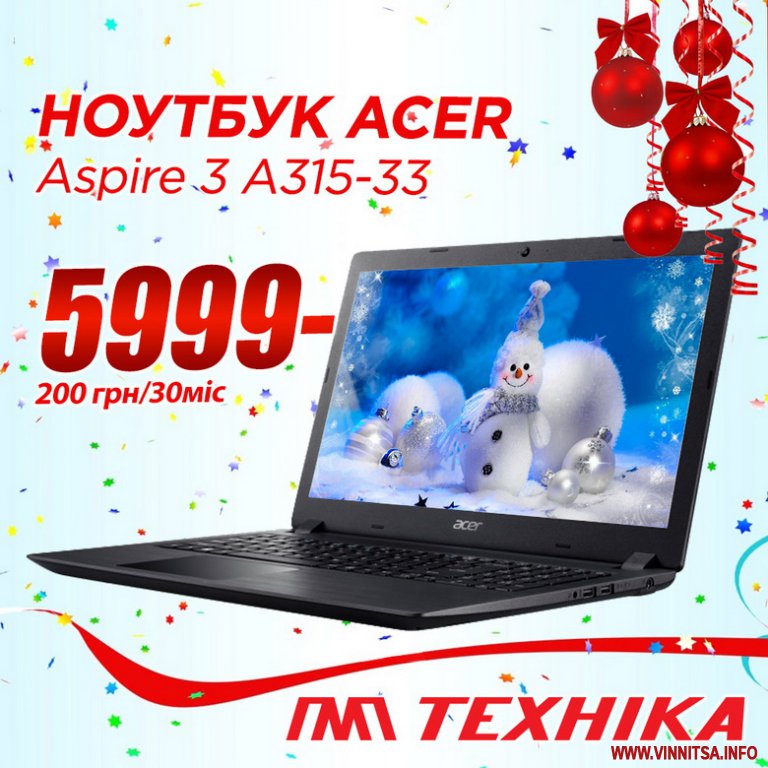 ноутбук Acer Aspire 3 A315-33 (NX.GY3EU.023) Obsidian Black для роботи та навчання всього за 5999 грн або в розстрочку 200 грн на 30 місяців+ 1000 гб в подарунок