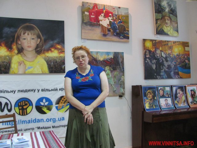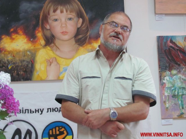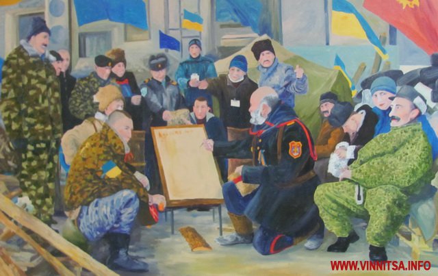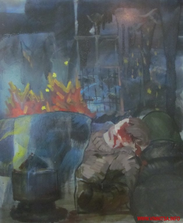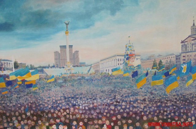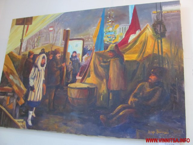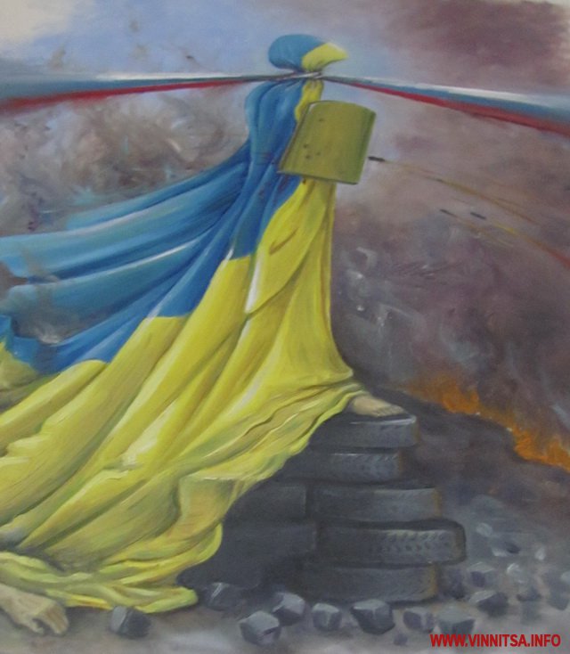 - Коли ми розвішували картини, зіткнулися з проблемою, як гармонійно розмістити їх по кольору і вираженню, адже всі дуже різні, - говорить директор Вінницького музею М. Коцюбинського Федір Панчук. - Є багато символічних, осуджуючих деспотизм. А в усіх без винятку головний герой - це Майдан, на який можна дивитися по-різному. Фотографи фіксують події, політики дивляться, як на зміну влади, а художники - мало того, що фіксують події, ще й вкладають філософський смисл.