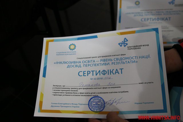 12 травня у Вінниці пройшов перший спеціалізований тренінг для освітян «Інклюзивна освіта – рівень свідомості нації. Досвід. Перспективи. Результати». Тренінги проводяться в рамках соціальної програми Голови Благодійного Фонду Порошенка, Марини Порошенко.