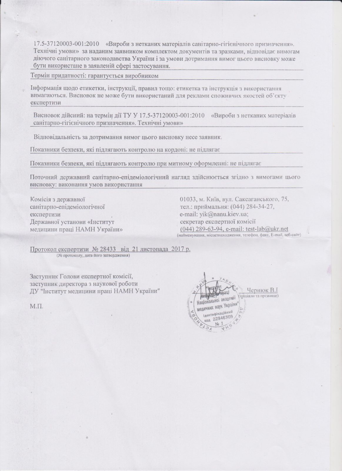 Висновок санітарно епідемічної експертизи на матеріал виробу 1,12017№602-123-20-1/37484 Протокол експертизи №2843 від 2017року. Т У 15.5-37120003-001:2010.