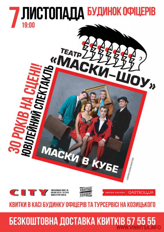 У виконанні улюблених акторів: Георгія Делієва, Бориса Барського, Наталі Бузько, Ігоря Малахова, Олександра Постоленко й Михайла Волошина вінничани побачать яскраве шоу «Маски в кубі», яке вже по достоїнству оцінили жителі столиці і багатьох інших міст України.