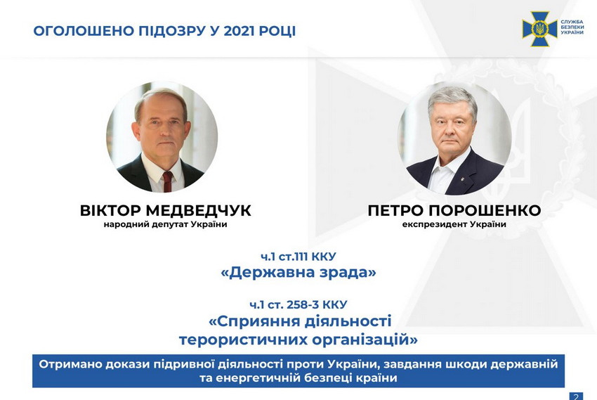 В Службі безпеки нагажують, що у квітні СБУ затримала Медведчука після втечі з-під домашнього арешту на початку повномасштабного вторгнення РФ 24 лютого. У 2021 році спецслужба оголосила кілька підозр Медведчуку. Він підозрюється у вчиненні державної зради, сприянні діяльності терористичної організації та замаху на розграбування національних ресурсів на тимчасово окупованій території Криму.