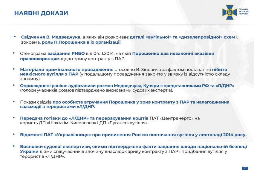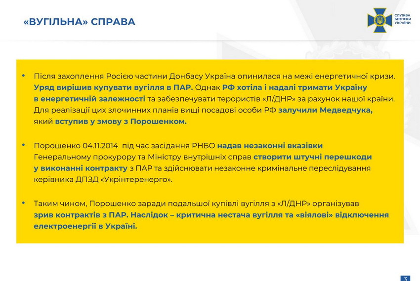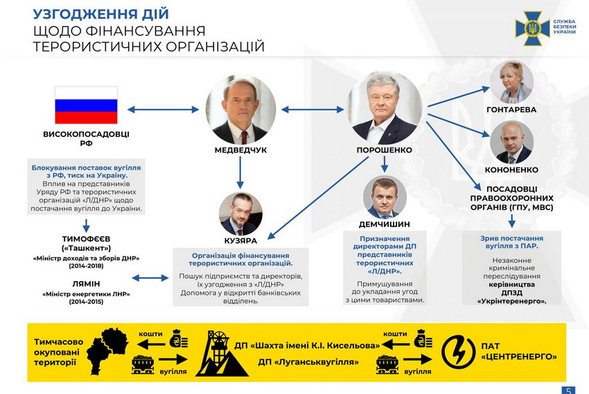 Крім того, Медведчук розповів деталі налагодження у 2014-2015 роках механізму закупівлі вугілля для потреб енергетики України на тимчасово окупованих територіях так званих «Л/ДНР», практично – у ватажків бойовиків.