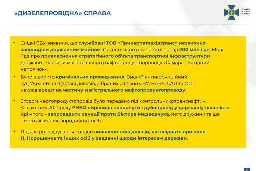 Затриманий Службою безпеки України Віктор Медведчук, якому висунуто підозру у державній зраді та сприянні тероризму, розповів про схему виведення з державної власності частини магістрального нафтопродуктопроводу «Самара – Західний напрямок» для подальшого прокачування через нього дизельного палива.