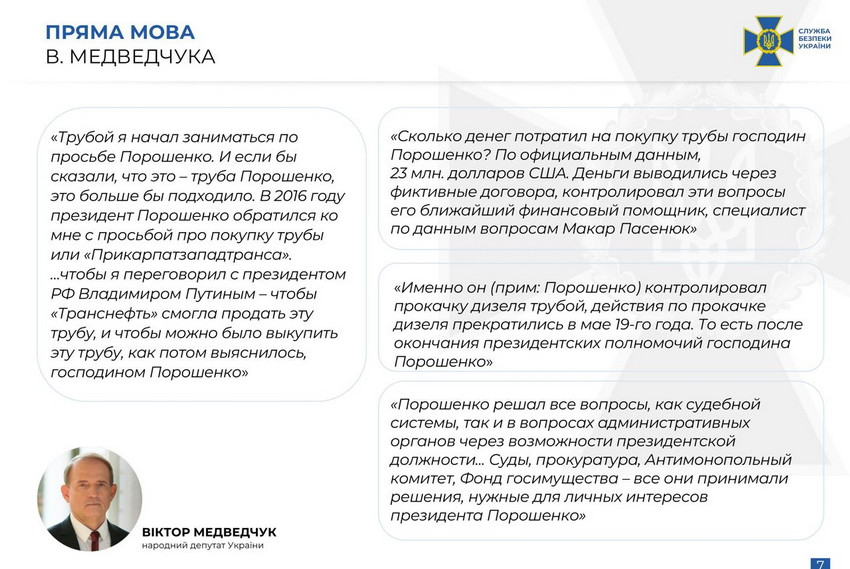 «Щоб цей трубопровід став приватною власністю, а по факту – власністю самого Порошенка, необхідно було виконати низку дій… Суди, прокуратура, Антимонопольний комітет, Фонд держмайна – всі вони приймали рішення, звісно, необхідні для особистих інтересів президента Порошенка», – повідомив Медведчук.
