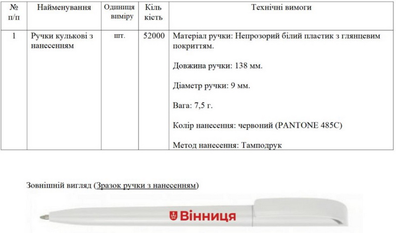 Виконавчий комітет Вінницької міської ради проводить тендер на закупівлю кулькових ручок з нанесенням герба міста на напису «Вінниця» в кількості 52000 штук. Очікувана вартість закупівлі 198 640 гривень.