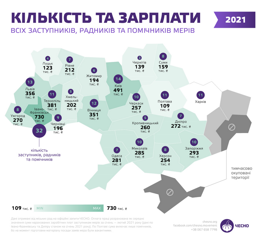 «Враховувалися лише ті особи, що працюють у міськрадах та їхніх виконавчих органах на платній основі. І дуже важливо, щоб мешканці міст співставляли кількість населення з кількістю заступників. Витрати на замів, радників та помічників мерів у містах із практично однаковим населенням та бюджетом можуть відрізнятися у шість разів. Кандидатури заступників мера подає сам міський голова, а погоджує їх рада. Як правило, заступники входять до виконкому. Депутати ради можуть виразити недовіру заступнику міського голови або своїм рішення вивести його зі складу ради, що автоматично має означати його звільнення», - зазначено в публікації.