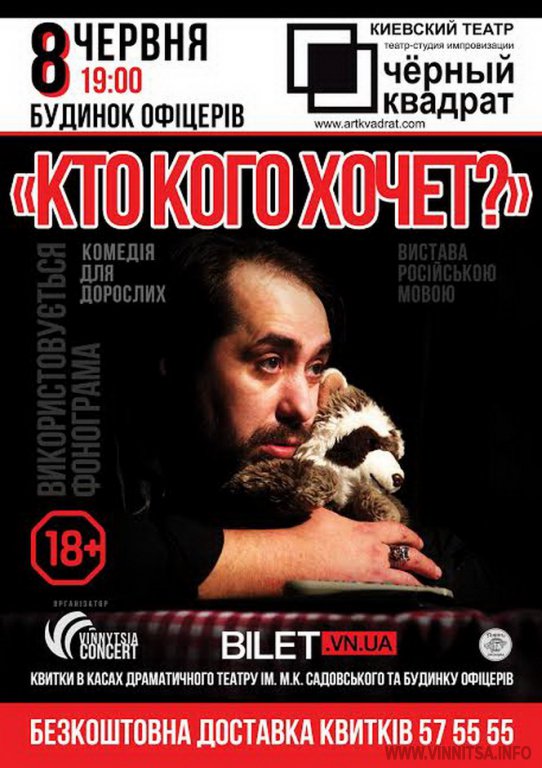 В среду, 8 июня, в 19.00 в Доме офицеров пройдут уже четвертые гастроли «Черного Квадрата» в Виннице. На этот раз на сцене винничане увидят звезд театра – необыкновенно талантливых актеров Алексея Курилко (кто не в курсе – да-да, это тот самый любимый радиоведущий и известный писатель-сатирик, чьи книги давно одни из самых успешных в Украине!) и Ирину Когут. В яркой, лирической и очень смешной комедии для взрослых «Кто кого хочет?..», которая давно стала хитом-бестселлером в столице, эта блестящая парочка расскажет о случайных встречах со странными продолжениями, а также о чувствах, которые остыли и требуют срочной реанимации и радикальных изменений…