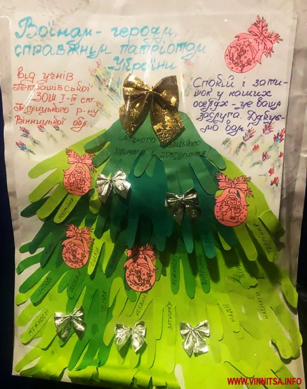«Дуже приємно, що кожного разу, коли ми збираємось на передову до наших бійців, дітлахи з усіх районів - Гайсинського, Бершадського, Тростянецького, Теплицького та Ладижина, пишуть листи, малюють листівки, власноруч роблять різні вироби та збирають передачки для армійців, які потім ми обов'язково доставляємо за пунктом призначення», - тішиться народний депутат. Ось і цього разу бійці похвалились, що в них є аж ціла ялинка побажань та привітань від школярів Петрашівської ЗОШ Теплицького району.