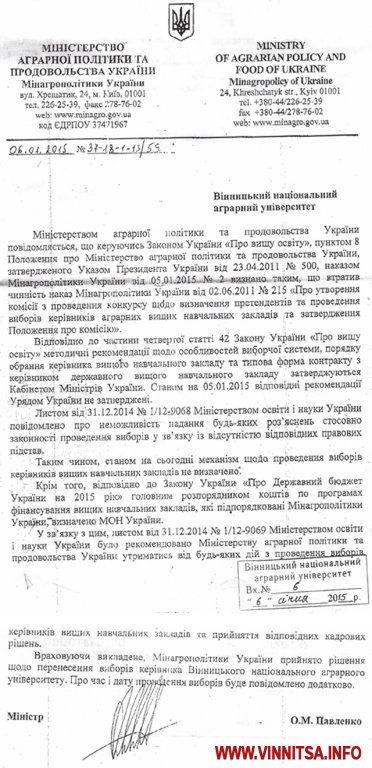 «Вінниця Реал» має в розпорядженні лист Мінагрополітики від 6 січня, згідно з яким вибори і перенесли. В листі йдеться, що «відповідно до закону «Про вищу освіту» методичні рекомендації про особливості виборчої системи, порядку обрання керівника вузу і типовою формою контракту ... затверджуються Кабінетом міністрів України. Станом на 5.01.2014 відповідні рекомендації урядом не затверджені». Крім того, Міносвіти направило лист від 31 грудня, в якому зазначило, що оскільки відсутні правові підстави, не можуть дати роз'яснення щодо законності обрання ректора.