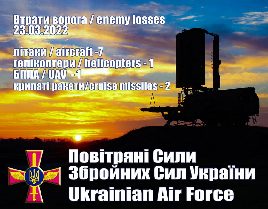Протягом минулої доби, 23 березня, на території України, війська повітряних Сил ЗСУ, знищили 11 повітряних цілей. Серед них – сім літаків, дві крилаті ракети та по одному гелікоптеру та «безпілотнику».