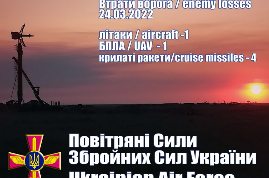 24 березня, українці вкотре завдали чималих втрат рашистам. Зокрема, у небі. Попри те, що ворог протягом минулої доби зменшив авіаційну активність. Зенітні ракетні війська Повітряних Сил знищили один винищувач-бомбардувальник Су-34 на Харківщині та чотири крилаті ракети.