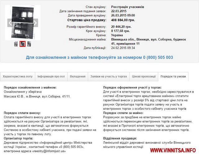 Ленінський ДВС Вінницького міського управління юстиції виставив на аукціон нежитлове приміщення по вул.. Соборній, 41 у м. Вінниця. Електронні торги проведуть 26 березня.