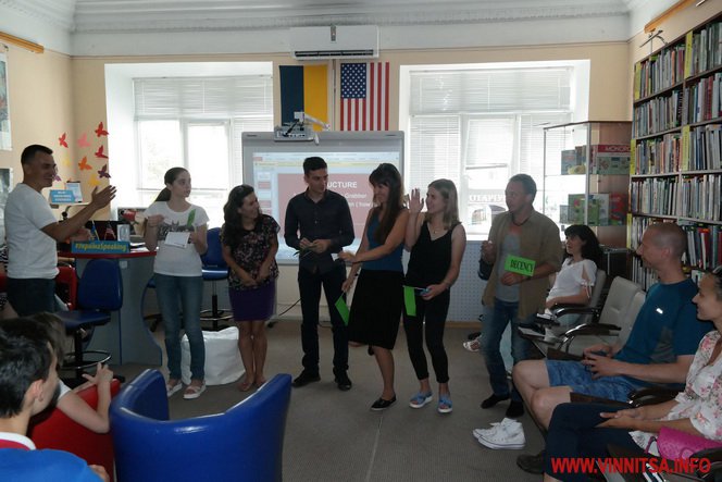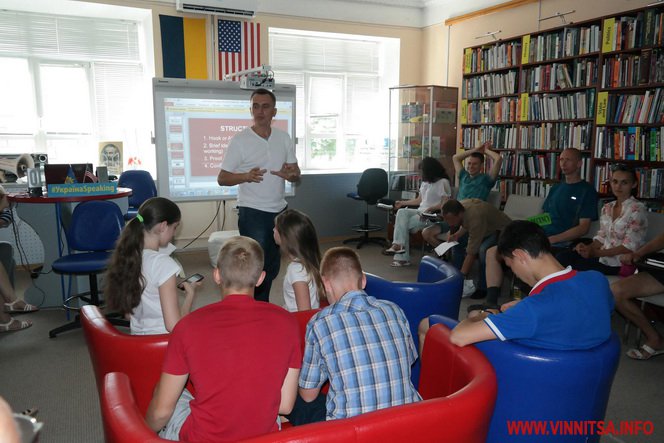 У інформаційному центрі «Вікно в Америку» при бібліотеці Тімірязєва представники Канади, США та Швеції разом із відвідувачами вінничанами вчилися спілкуватися та переконувати інших. Дискусія відбулася 16 липня в рамках заходів до року англійської мови в Україні.