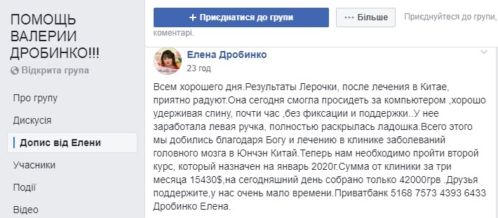 «Результати Лєрочки після лікування в Китаї, приємно тішать. Вона сьогодні змогла просидіти за комп'ютером, добре утримуючи спину, майже годину, без фіксації і підтримки. У неї заробила ліва ручка, повністю розкрилася долонька. Всього цього ми домоглися завдяки Богу і лікування в клініці захворювань головного мозку в Юнчен, Китай. Тепер нам необхідно пройти другий курс, який призначений на січень 2020 року. Сума від клініки за три місяці 15 430 доларів, на сьогоднішній день зібрано тільки 42 тисячі гривень. Друзі, підтримайте, у нас дуже мало часу», – пише Олена Дробинко.