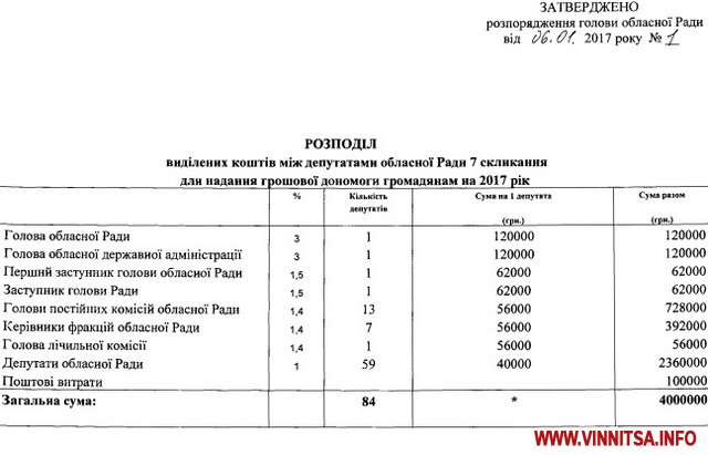 6 січня голова Вінницької обласної ради Анатолій Олійник підписав розпорядження Про розподіл виділених коштів для надання грошової допомоги громадянам в 2017 році. Рішення повинні затвердити депутати на черговій сесії облради.