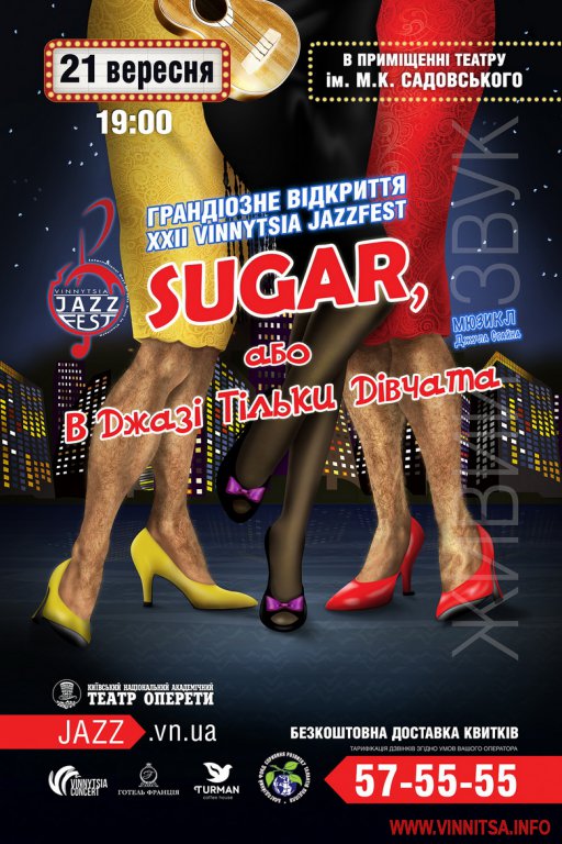21 вересня у Вінниці відбудеться грандіозне відкриття ХХІІ міжнародного джазового фестивалю VINNYTSIA JAZZFEST-2018. Глядачі зможуть побачити легендарний бродвейський мюзикл «Sugar або В джазі тільки дівчата». Більше 100 артистів на сцені. Культова історія, яку люблять мільйони. Запальні джазові ритми, танці і приголомшлива краса. Розкішні костюми, креативні режисерські рішення і геніальне виконання кращих солістів Національної оперети України.