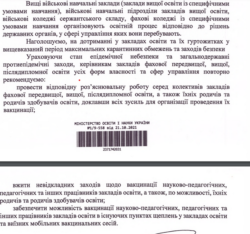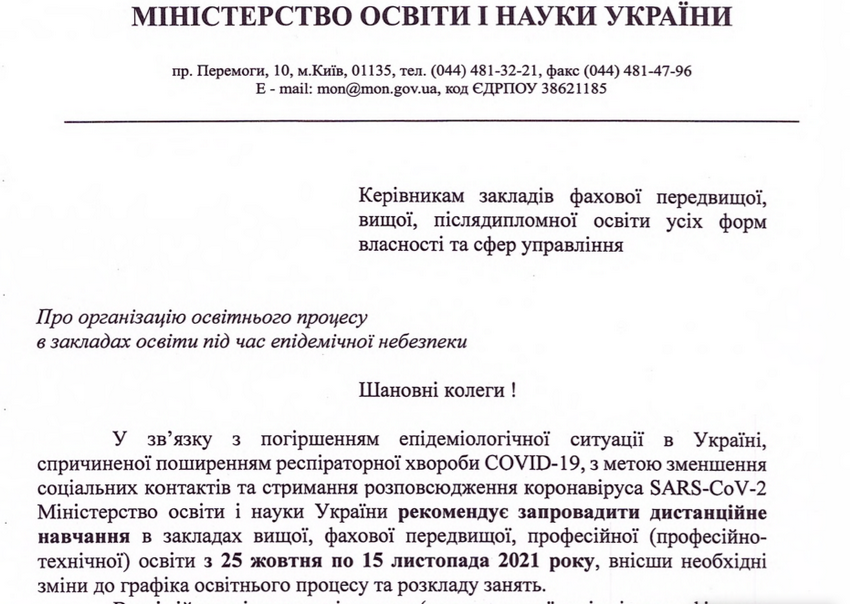 Міністерство освіти України рекомендує запровадити дистанційне навчання в закладах фахової передвищої, вищої, післядипломної освіти з 25 жовтня до 15 листопада.
