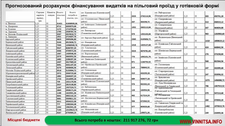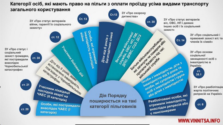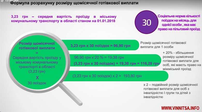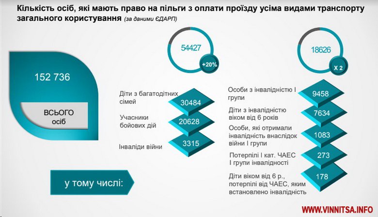 У Вінницькій області майже 153 тис. осіб, мають право на пільги з оплати проїзду всіма видами транспорту загального користування. Серед них є категорія, понад 54 тисячі осіб - учасники бойових дій, діти з багатодітних родин та інваліди війни. Ці три категорії мають право на міжміський проїзд і компенсація при розрахунку їм буде збільшена на 20%. 18 тисяч осіб, - особи з інвалідністю першої групи. Їм при розрахунку компенсацій, готівкова сума буде збільшуватись вдвічі. Решта осіб, які мають право на міські перевезення, їм здійснюється стандартна готівкова виплата. Загальна сума, яка необхідна для компенсації готівкою проїзду пільговиків, у Вінницькій області складає майже 212 млн. гривень на рік.