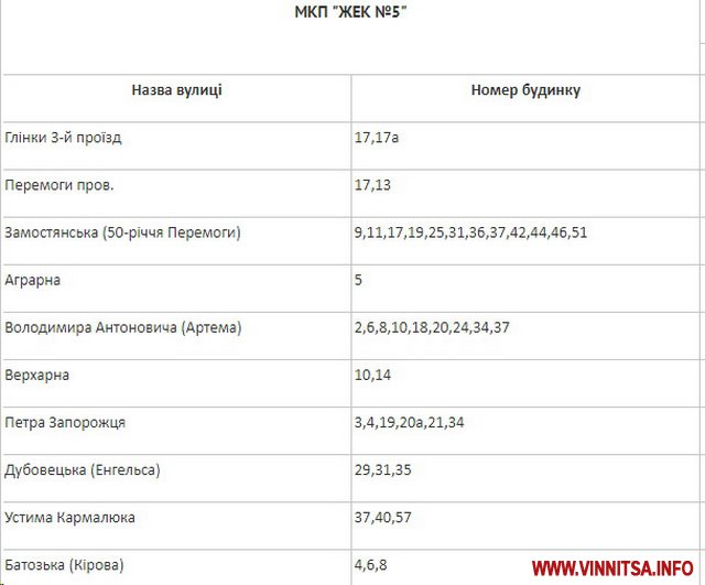 Перелік будинків, закріплених за МКП ЖЕК №5