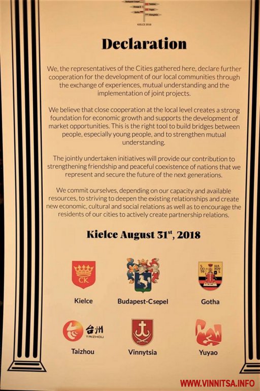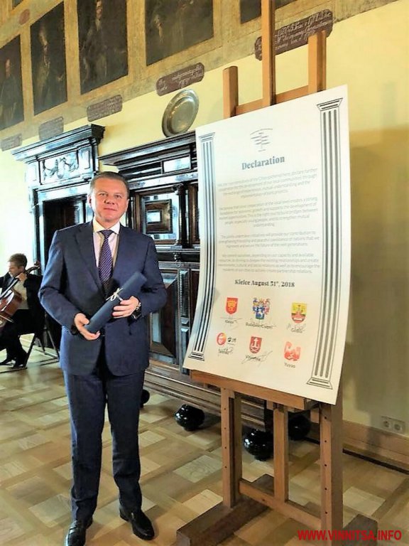 Вінницький міський голова Сергій Моргунов з делегацією перебуває в польському м. Кельце. 31 серпня мер Вінниці підписав Декларацію співробітництва та розповсюдження ідеї побратимства з президентом м. Кельце Войчехом Любавським.
